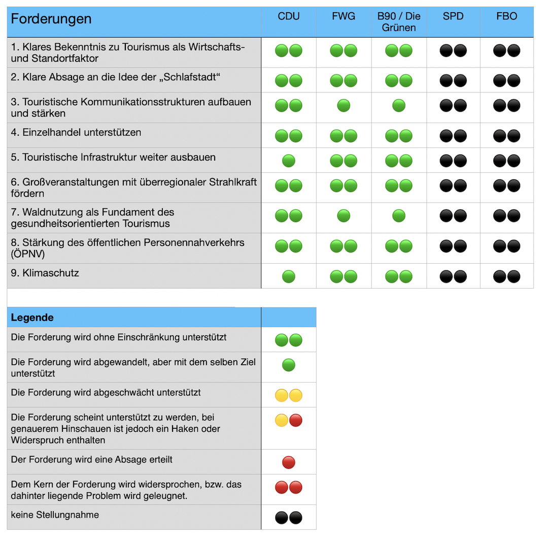 In ihren Stellungnahmen bekennen sich CDU, FWG und Grüne klar zum Tourismus als Wirtschaftsfaktor für die Stadt und erteilen allen Ideen einer Schlafstadt eine klare Absage. Auch die Forderung des HOGA den örtlichen Einzelhandel nach dessen Bedürfnissen zu unterstützen wird uneingeschränkt zugestimmt. Besonders erfreut ist der HoGa darüber, dass alle drei Parteien die Strahlkraft überregionaler Veranstaltungen anerkennen. Dieses schließt auch die Forderung nach unbürokratischer, politischer und finanzieller Unterstützung für Veranstalter*innen, die Events aus dem Aktiv- und Erholungsbereich in der Stadt ansiedeln möchten, ein. Große Einigkeit zeigen alle drei Parteien auch beim Thema öffentlicher Personennahverkehr. So wird die Forderung nach dessen konsequentem Ausbau uneingeschränkt unterstützt, ist dieser doch wichtig für Lebensqualität, Tourismus und Klimaschutz.